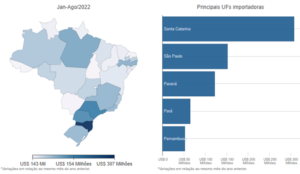 Até agosto deste ano Santa Catarina foi o maior estado importador, com 32,5%. Em 2021, o estado representou 34,4% das importações, o que significa aproximadamente US$ 422 milhões.